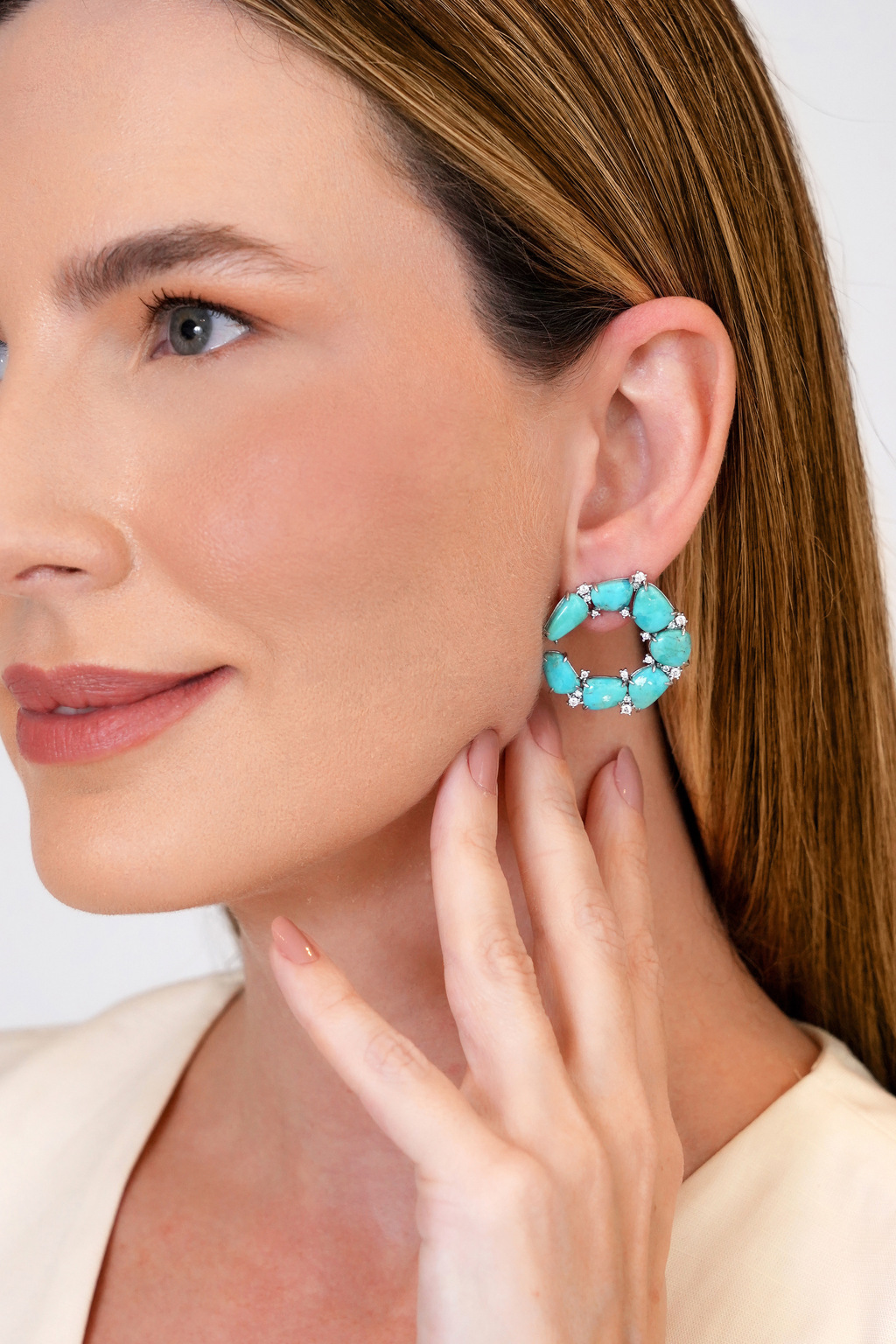 Cravação e Lapidação: Brinco Modelo Argola em Turquesa Natural e Moissanites.